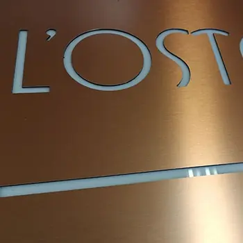 El letrero está hecho con marco de acero, panel de aluminio tallado o conformado con cortador cnc. El logotipo y las letras están "tallados" en aluminio, se inserta una hoja en la parte posterior de plexiglás opal para difundir la luz, y el sistema LED para iluminación nocturna está hecho en su interior.